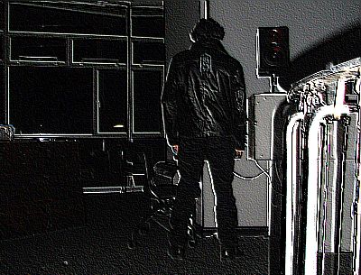 There was a real feeling of eerier-ness as we approached The Rotunda at Winchester art college, where Vomir- French king of walled noise played his (un)live set on Saturday 15th of November. In the mid 1960’s the building was commissioned as the art school’s library, but it hasn’t been used for this purpose for many years. The two levelled rounded glass & concrete building has be described as either a ‘concrete castle', or ‘a modern medieval book-tower’, but tonight as we approached the building from the car park it felt rather creepy- with it’s minimal strip lighting it brought to my mind the late night deserted setting of a campus based slasher from the early 1980’s. The Rotunda is connected to the one the main college buildings by a walk way. And slowly but surely the audience of around twenty people made their way into the upper level to be met by the solitary figure of Vomir, standing motionless & with his back to the audience. It took around five or so minutes for the audience to select their seats & settle, and though-out all this time the Frenchman remained still & turned away from the spectators.