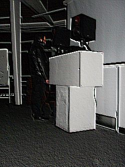 The performance itself was in a striking little building called the Rotundra - a squat, circular construction, surrounded by a moat, and joined to the main building by an enclosed, first floor walkway. An impressive venue. Vomir was set up on one side of the inner circle of the room, with the spectators congregating opposite and around the edges of the circumference. In the middle of all this, a spiral staircase led down to the lower room. I’ve described the room in this detail, because it become an important element in the performance itself. The performance, as you might predict, was the usual non-performance: Vomir stood facing away from the audience, motionless in the darkened room. He played for around twenty minutes, a spitting wall of gravelly noise; static and unrelenting. What became interesting, was that the wall, or rather my perception of it, certainly changed during the set. I think the unusual nature of the room played a part in this. The inner circle of the room was marked out by white boards (I won’t pretend to know their purpose), which tilted on horizontal axes. These acted as barriers and bafflers for the sound. At the very beginning of the wall, with my eyes closed, I had the really distinct sense of being in a busy canteen. Noisy, overlapping conversations, scraping chairs, hubbub and bustle. As the wall progressed, these aural hallucinations changed, but none were as scarily precise as that first one. Later on, I could hear odd bass loops, strange tectonic lurches that rose up and disappeared. Tilting the head slightly changed the sound radically - though unfortunately the best listening position seemed to be an uncomfortable backward angle… The PA was, admittedly, two small monitor speakers - a potentially comic situation - but they really were very adequate, filling the room but not demanding earplugs. However, this meant that we missed out on the overwhelming volume of a more typical Vomir performance.