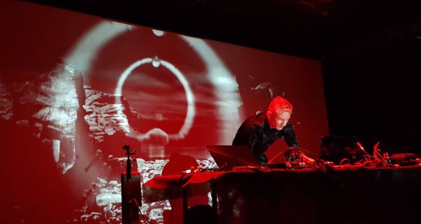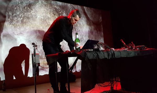 There was another short break. With everyone was waiting eagerly performance of the legendary Peter Andersson/ Raison D'Etre. Peter calmly and modestly walked up to the stage and stood next to the last laptop. Next to the table, to the left was a rack with a curved piece of metal suspended from it. A 3D cross appeared on the screen, soaring among the dark fog and the performance of Raison D'Etre began. Peter created a dark and eerie atmosphere of doom and loneliness, diluted with rather aggressive fragments. There is no trace of the slightly airy and sublime sound of the early Raison D'Etre albums. Only darkness, sadness, loneliness and suffering, woven into one sound stream. Single bell beats and rare percussion sounds invaded this atmosphere. The feeling was created that the air was filled with these sound vibrations, and the hall is the epicentre of the invisible ghostly tornado. Peter used several devices to give the sound fresh shades- taking in iron, cymbal and violin bow, as well as a very interesting, almost fantastic, device, which I would characterize as a wind controller. On the screen during the performance, slow, almost static footage with a floating cross, bone macro photographs, a kind of pupil resembling a fire funnel and various textures were shown. If with the Desiderii Marginis set, the video was inextricably linked with the sound, then in the Raison D'Etre set, the video carried a rather supporting function. The video was just as a fact, but all the attention of the audience was paid to Peter Andersson. He was very focused and attentive to what he was doing. I think that he did not make any mistakes in his performance. Of course, an integral part of the performance was a bottle of beer, which Peter finished just at the end of his set. The last sounds were silent, Peter thanked the audience, and the hall generously awarded the musician with applause. The concert is over.