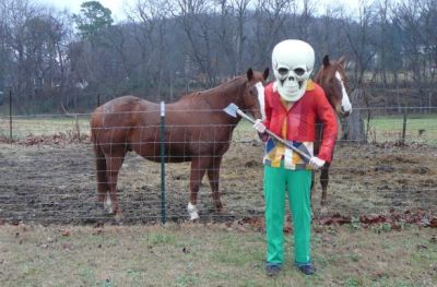 PB The costumed models are characters in some sense, but it’s more a generic theme reserved for our albums that are recorded using predominantly organic instrumentation. The characters in the “warrior-and-weapon” theme could relate to some recurring lyrical elements in the Pumpkin Buzzard universe, but that connection isn’t premeditated. The canine weapon being held on the cover of Horse Machine belongs to one of the band members.