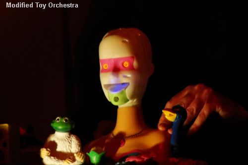 They were followed by a kind of inversion – five rather straight-looking suits playing woozy, glitch-filled electronica, preferring old Fisher Price and Tomy toys to Free School’s array of Korgs and Rolands. This was the work of the Modified Toy Orchestra, the notorious circuit benders who behave like Dr Frankenstein among play school graveyards. Their gimmick, of rewiring toy cameras, rockets, and mini keyboards, is initially a delight to behold delivering a neat nostalgia kick, but as the set drew on the novelty fades. Surprisingly, in its place there slowly formed a new world of electronic textures and treats as the 8-bit pop of their opening pieces that occasionally reminded of early μ-Ziq or Björk’s ‘All is Full of Love’, was replaced by more beatless territories to form a nightmarish nursery of eroding synths bristling with distortion over which a dismembered dummy’s head painfully narrates as her batteries run dry.