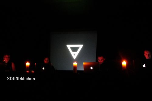 Returning to The Custard Factory equipped with a new sense of the city, the small theatre hosted a deep listening experience of Pauline Oliveros’ ‘Earth Ears: A Sonic Ritual’ interpreted by local electroacousticians the SOUNDkitchen collective. Iain Armstrong, Julien Guillamat, Annie Mahtani and Shelly Knotts marched purposefully onto a very dark stage to install themselves behind their evenly spaced laptops, each solemnly taking it in turn to light their respective candles. Gradually the pops and crackles of fire moved through the space joined by crisp, breathy airborne textures as occult symbols behind them cross-faded from circles to triangles and back again. Exquisitely engineered kaleidoscopic interchanges of other elements from earthy rumbles to tidal textures patiently cascaded as the audience were forced to look upon these almost stationery figures, barely discernible in the darkness, seated as if they held some arcane knowledge with which to control the elements.