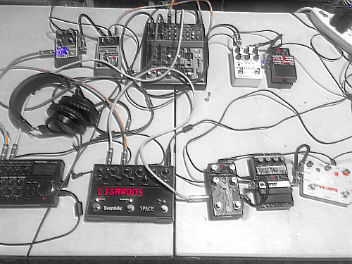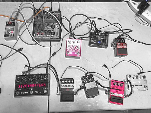 Ken: I don't have a set grouping of gear and pedals for Hana, I never have. The only thing that stays the same is two looper pedals at the start of two chains of gear. I put a number of sounds on each looper, sometimes mutilated beforehand, and run them through as source noise. I try and have varying lengths of time of sounds on each pedal to create a variety and loose dynamic feel. The pedals in the rest of the chain are never the same, I'm always changing and adjusting while doing set-up and I doubt I've ever had the exact same gear lined up in any two walls. This keeps my own interest up and lets me experiment with different effects. And I'm a pedal hoarder and I have many, I never sell my stuff. It's all about 'ooh, let's try this' and the more gear I have the more sounds I can exploit. I've tended to use lots of reverb and waveform distortion through the years so I have quite a few of those requisite pedals in my collection.