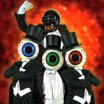 Only two years after the Wormwood show at the Holland Festival, The Residents are back to promote their DVD Icky Flix. The DVD contains a compilation of filmmaterial they made over their 30-year career with new arrangements of the old music. When the houselights dimmed one eyeball entered the stage to wave hello and start the DVD with his remotecontrol. The band entered the stage without eyeballs this time. Of course they were masked, but with headlights this time. Mr. Skull had a new mask and there was a female singer with them.