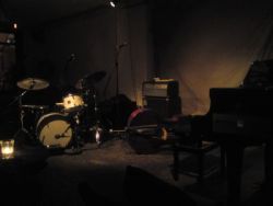 The stage was set-up with grand piano, double bass and drums, sensitively illuminated, surrounded by a few small candle lit tables and the Oto’s characteristic swarm of rickety wooden chairs and reclaimed benches. Many in the audience clearly knew what to expect and so had arrived with cushions in hand. The prospect of be distracted from the Necks singular brand of boundary crossing jazz by an aching backside clearly would not do. At around 8:45pm the band casually took to the stage, Tony Buck to the drums, Lloyd Swanton to his bass, and Chris Abrahams to the lovely Yamaha Grand nestling half in the gloom.