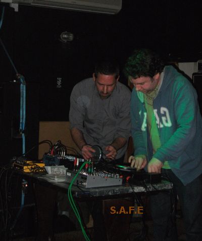 Next up is S.A.F.E who are a English/Irish male two piece who make dense harsh noise with a few dwells in 'walled' textures, & some buried groove like moments. Their set starts off as a sudden tunnel of thick noise texture that’s scraped & ripped by sudden raisers of high pitch sound. To start with one member is pressing a microphone to his mouth- creating more textures to pile on the dense mesh of noise instead of vocals. The other member is manipulating pedals and putting cds of field recordings into small cd players to manipulate their textures too - both elements add to the thickness of the sound. As the set goes on both members focus more on pedals, field recording cds, and other electronic equipment. And it’s during this part of their set they create a dense cage of sound which ever so often swims with groove based textures that go from locked mantras onto to bouncing, stuck & fried beats structures. But for all the beat bound/ groove elements the noise textures still very much remain in place. The single morphing track lasted around the twenty minute mark, and all told it's an enjoyable take on Hash noise taking in buried and brutal electronica textures, and manipulated field recordings.