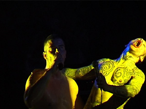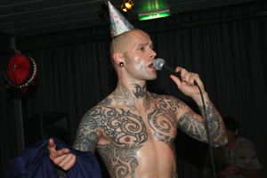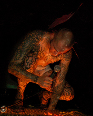 FH The performance aspect was always very important. We wanted our concerts to be visually interesting and to let our bodies be taken away by the convulsive energy of the music. By being more or less nude we try to eliminate the borders of our self, to dive into a sort of cathartic "RAUSCHZUSTAND" - a vortex which drowns us, the audience, the venue and the conscious universe. We use a lot of dirt which might refer to entropy, "lower" life forms, death - there are flowers, bull-sperm, food, tattoos, violence, tenderness. What we are doing is not regarded as art by the art establishment - and music purists are offended by our theatricality.