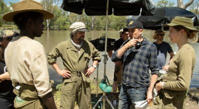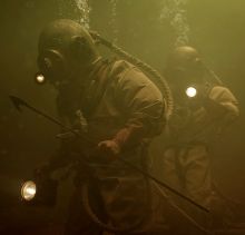 Matthew: The old diving suits weren't too difficult to source. I found a professional diver in Victoria who had the Standard Dress Dive gear that he still uses regularly. He became our Diving Consultant - both on the script and with the production. We used the real suits and helmets when you see the characters suiting up on the shore, but they were extremely heavy and the cast could only wear them for short periods of time. For the underwater sequences however, those were all shot "dry-for-wet" in a regular sound stage dressed like a river bed, so we had light-weight copies of the diving gear made by the costume department. The actors could move around quite easily and safely because there was no water involved.