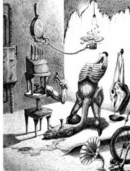 M.Waldron The Surrealists (in the sense of the actual, historical movement) that I've been most inspired by are Max Ernst, Yves Tanguy (ding!), Kay Sage, Leonora Carrington and Hans Bellmer. Contemporary Surrealist practitioners that have swelled the juice in my grapefruit are Mr. Stapleton (of course), Jan Svankmajer, William Davison, Jim Woodring and Christoph Heemann. An equally important name for me to mention is Kim Rifredi, a cousin of Richard Faulhaber's whose brilliant assemblage pieces were an enormous influence during the early 90s. Sadly. I don't think she is active in this area anymore; from what I understand, she has moved on to embalming corpses.