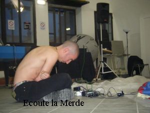 ECOUTE LA MERDE (France) brought pure violence on the stage with the forth performance of the night. He used an old tape recorder as sound source to create an unusual static sound flow. A sound spiral seemed to haunt the room, while the artist would rock back and forth to it; after a couple of minutes, he used a hammer to literally dismantle the recorder. The sound started to fade slowly while pieces of the tape recorder flew all over the place until the signal finally died. A devastatingly fast and impressive performance.