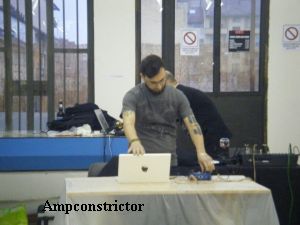 The following performance was by AMPCONSTRICTOR, Giovanni Torregrossa's HNW project. His semi-digital wall of sound was generated by a PC connected only one analog pedal. The sound generated this way was intense and brutal, but not completely static, in fact the artist widely used pan-pot stereo spatializations between the two speakers, creating a lively flow that would gradually grow within the length of the performance. As his stage name implies, AMPCONSTRICTOR seals off the speakers in a tight squeeze.