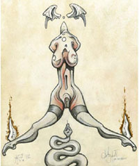 KNVBIRecords will be releasing “In Eros Veritas” on LP. It’s a five-track work based upon personal experiences. This should be out in the fall. Recording is done and I have to complete the paintings for the accompanying cover art. They’re a fantastic label run by an extremely friendly guy. I suggest checking out a band they’ve just pressed called Vanessa Van Bastian. House of Alchemy has me appearing on a compilation CD first and later a split with another artist. Aside from all this, I’m painting and drawing in attempts to score an exhibition or two on the west coast, which is where I’ll be residing for at least the next year.