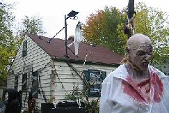 There’s no pause after the 25 minutes of the first movie; The Melvins continue to play and the title of the second movie appears on the screen: Spook House (also from 2003). The name already says what this is about; the subject of this picture is Halloween. Driving through the working class suburbs of Detroit an alarming portrait of rituals prior to this tradition is shown, particularly how the conventional American lane are adorned with dolls, grave stones and body parts. Between the flickering way the movie was shot (quickly changing pictures and varying black / white and colour shots) a couple of images struck me: a witch on a broomstick crashed into a commercial pillar, hanging dolls in the front garden, Mr. Death himself carrying a sickle, pumpkins… The light is the hall is changed to dark red to emphasize the frightening mood of a horror movie once again. The pulsating noise performed by The Melvins is helping a lot to accomplish this feeling, and the movie appears to last a lot longer than the actual 20 minutes it stands for.