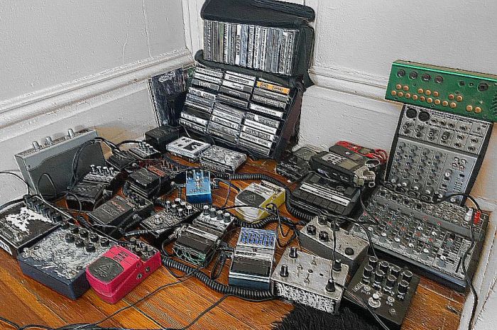 Cory: Ok soooo! Right now I’m using my Behringer Xenyx 1202FX mixer and going into it is The Great White Death Machine (Deathbed Tapes) the Noise Rumble (lefty’s Sound Lab) and my favourite the Hadron Collider (Electro Lobotomy and those three amazing contraptions going into a pretty standard 2 or three chains consisting of 2x DOD death metal FX86b, Digitech Death metal, A Boss Metal zone, a Behringer Ultra Metal, the DOD Bass Grunge FX92, a Metal Muff, a Walrus Audio DECENT, and last but not least a DOD Bass EQ FX42-b and a Behringer Bass Graphic Equalizer.
