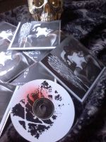 I’ve reviewing the CDR version- the disc its self-features red & black spray painted front. And the folded sleeve is black & white, featuring on its front cover a naked woman sitting on a chair holding a skull in one hand & a candle in the other. Like a lot of this projects other release there’s a distinctively grim & lo-fi black metal look to the releases presentation.