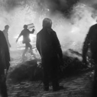 Next, we of course have the Whore’s Breath track “No Favor”, and this is a more set and battering example of the wall form. We find a mixture of rolling ‘n’ droning billow, rapidly cluttering rattle, and slight skittering static grained jitter. Tonally we have just lows and mids here, with the sound being a lot blunter and ragging than the first track. I’m get a feeling of the last ebbs of a riot-as both protestors and police stagger, as they still just about fight on as the streets and fallen bodies flame and smoke. This track is a nice contrast to the first track, and works well in the context of the split.