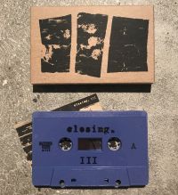 III by closing. arrives from Modern Tapes on a purple cassette in a smart printed cardboard box, along with a tiny inlay, a card advertising upcoming Modern Tapes releases, a sticker, and a download code. The album has three tracks, all blending eerie drones with lo-fi field recordings; a focused sound but a good one.