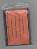 Over on side two we have Chaste track, and this comes under the title of “The Chocking Game”. And compared to the wall/ drone blend of the first side- this second side is a lot more straight HNW. It’s built around three or so layers of juddering ‘n’ slowly buffering noise layers, which are meshed together to create a wall. The textures used fall in the lower-to-mid tonally range- though they are all fairly close in their range, and really these just move in a fairly simple & familiar pattern range. At times it feels like one layer is slowly or speeding–up slightly, or another is more prominent in the ‘wall’, but I think ultimately this is a set pieces of wall-making. On the whole it kept me locked in for it’s full length, though it did feel a little unremarkable- on the whole just an ok ‘wall’.