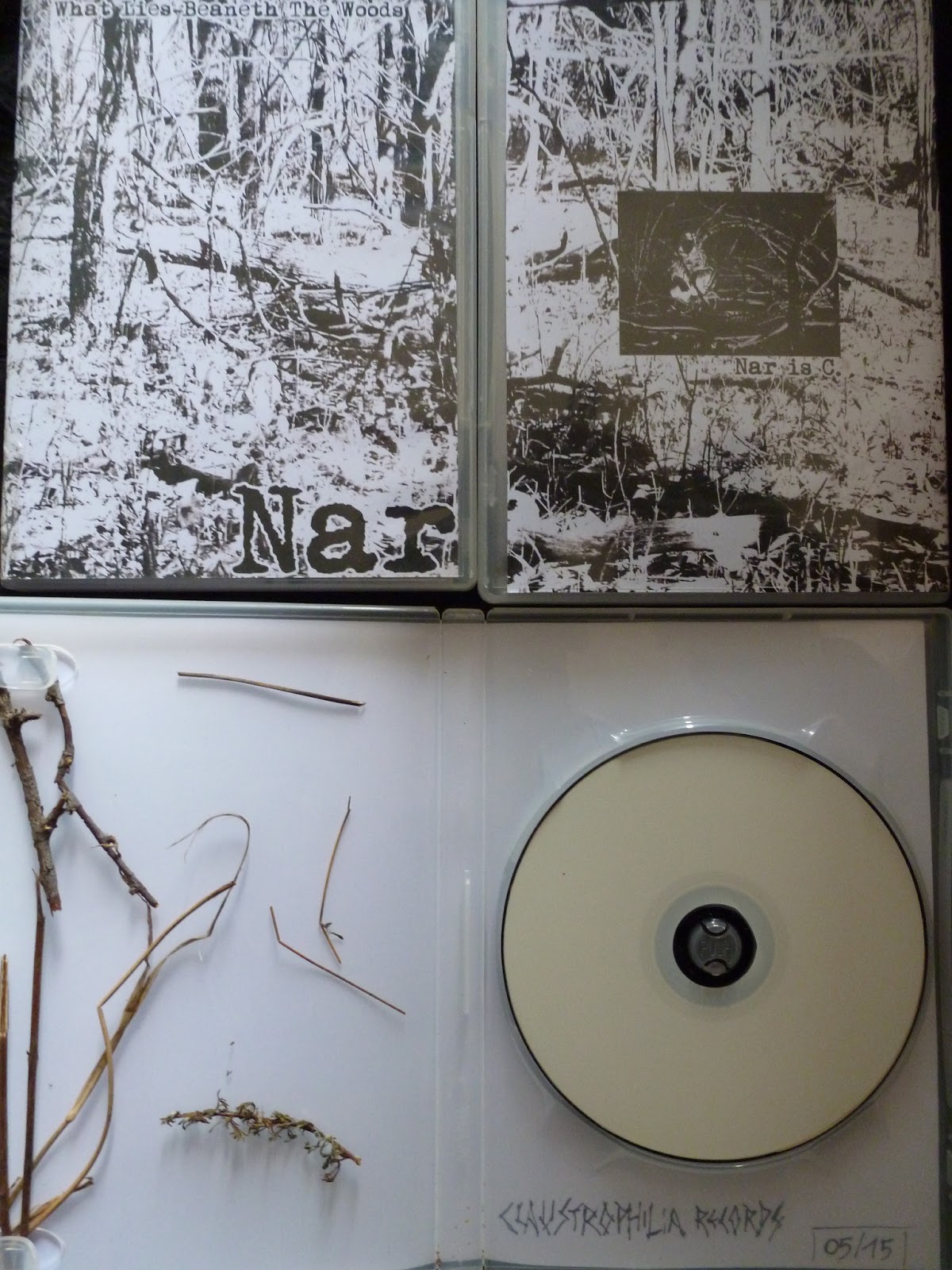 The CDR comes in a see-through DVD case that features grey photo-copied like cover that takes in a picture of some fairly dense yet bleak looking forest. Under the sleeve & inside the case are leafs, sticks & bits of long grass.