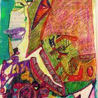 The sharpie written CDR comes in a see-through sleeve. This features complex drawn and pen/felt tip coloured cover featuring different abstract patterns/shapes, some of which could be seen as either faces or mouths. I like the cover artwork, though I’m not sure if its colourful tone fits the often grey & points machine-tinged oppressiveness of the sonics with-in. The split is separated thus five tracks from Panata Rhei, and their brand of black metal, and two around twelve-minute walls from Thar Desert.