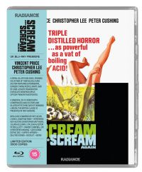 Scream And Scream Again - Scream And Scream Again( Blu Ray) [Radiance Films - 2023]From the early 1970s, and boasting three horror film stars Vincent Price, Christopher Lee, and Peter Cushing. Scream And Scream Again is a decidedly unpredictable blend of serial killer mystery, medical thriller, and totalitarian drama- all edged with light touches of horror & gore. So, it’s certainly a rather distinctive creation- which it’s not wholly successful- but it has its moments. Here from Radiance Films is a Blu-Ray release of this difficult-to pigeonhole film- taking in an HD scan of the film, a new audio commentary, and a few extras- be they new or archived. Scream And Scream Again ( aka Screamer) is from the year 1970. It was filmed in London and Surrey- been produced by Amicus Productions- who of course are most known for their Horror Anthologies in the 60s/ 70’s. The film was directed by Berlin-born Gordon Hessler- who had forty-eight credits to his name- with these evenly split between TV work & feature lengths. Feature length-wise he helmed the Supernatural thriller The Woman Who Wouldn’t Die (1965). Gothic horror The Oblong Box(1969), Adventure fantasy The Golden Voyage Of Sinbad (1973), and ninja action film Pray for Death (1985). I’ve been aware of Scream And Scream Again for at least twenty-plus years- and with its cast, and very neat body in an acid bath poster artwork I always wanted to see it. I wasn’t very sure of quite what it was about- but its title & poster artwork suggested some form of acid bath serial killer- but the reality is definitely not that clear cut, and to be honest it’s an often rather confusingly plotted affair, with only really Mr Price having a lead part in the film- with Cushing only appearing in the scene, and Lee popping up a few times. The film opens with a man jogging through London as the credits roll- he grabs the side of his chest, and next, we know he’s in a hospital bed- though it’s clearly not a standard facility- and this is very much impacted as the man pulls back his bed sheets to find one of his legs has been removed. As the film opens up we get introduced to three sets of stories/ characters there's a series of Sex murders being carried out in London, which is been investigated by moustached & often grumpy Detective Supt. Bellaver( Alfred Marks). We have a totalitarian state- which feels rather Nazi-like in its presentation, and here we find the power-hungry Konratz(Marshall Jones) who is coldly focused on where he wants to get. Lastly, we have Dr Bowning (Vincent Price) who is doing some form of experimentation in his country house/ lab.