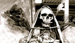 Tinieblas - A Skeletal Figure Clad...In A Long Robe [Absence Tapes - 2010]Tinieblas is a USA based project that features one of the members of the four piece HNW collective XSXCXEXBX. 'A Skeletal Figure Clad...In A Long Robe' is the projects first release and the listener is offered up two sides of C30 tape that takes in active, but brutal HNW matter. The project takes it’s influences and themes from the Mexican drug wars and various Mexican gangster related folklore characters like: Jesús Malverde- who’s known as the "generous bandit", "angel of the poor” or “narco-saint”,and is celebrated and praised by those involved in drug trafficking. But in particular this release takes it’s title and imagery from the figure of Santa Muerte(which literal means Saint Death in English) who’s often depicted as a skeletal figure, clad in a long robe and carrying one or more objects, usually a scythe and a globe. The tapes cover illustration is of a gold foil embossed picture of Santa Muerte. Side A is taken up by the title track which starts out with a nice coarse & seething downpour of razor sharp static tone rain which is moves between: two part 'heavy rain on perspex corrugated roof' clamouring tone attack, and suddenly moved blocks of noise tone that have an almost harmonic progression about them. As the track goes on the constant thick wall of hammering rain static tone is kept up to a roaring and unforgiving level, yet there is movement and change with in the tones pattern as it batters into you. Around the nine minute mark the track starts to break down into juddering and uneven semi-dying motor pattern. You keep thinking it’s going to suddenly splatter out all togeather, but it keeps it’s nice jumping and juddering feel- sometimes bare so and at other times in quite a rapid and persistent manner. Then just in the last few minutes the track takes off with this snaking spray paint or demented snake hissing static tone that slides into stirring roar just as the track exits. Over onto to side B and this is taken up by the track ‘A Tithing of Cocaine for their saint’ which starts out with just under a minute of muffled recordings of ritual praise in Mexican tounge that’s suddenly bombarded by quick second cuts of noise grain. Then we jump into a furnace like ‘wall’ of roaring tone which is made-up of one stuck roaring tone, and another slightly more juddering and snaking tone which gives the track quite a nice teeming and slowly feasting feel. By the three minute mark it’s like the furnace door has been opened and shots of molten bellowing tones are ravaging your face and head in nice sustained yet shifting attacks of roaring and melting noise, which ends up pushing you to the floor in a singed and smoking mound. The rest of the track alternates between hamering, slightly train track chugging dwells and roaring furnace ear engulfs- through it stays longer in one grain & groove than early in the tracks length. 'A Skeletal Figure Clad...In A Long Robe' is an effectively brutal open shot of shifting and face-melting Harsh Noise wall matter that focus in on some quite original and distinctive influences.      Roger Batty