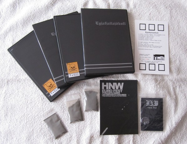 Various HNW Artists - Eyjafjallajökull [Toxic Industries - 2010]The first European Harsh Noise Wall festival had been planned to have taken place on the 17 April 2010 in Paris, France. It was sadly cancelled due to the eruption of volcano Eyjafjöll under the glacier Eyjafjallajökull in Iceland, which blocked all European flights for over a week and meant none of the artists could get to the festival. This two disc set commemorates the festival that never was in splendid fashion, as it features a track from each project that was due to have played at the fest. This whole set is wonderful throught-out and put together with two high quality CDR’s feature lightscribe artwork. Also in side the DVD double box we get: an original flyer that was printed up for the fest, An original badge that was due to have been sold at the fest and a 10g bag of real volcanic ash direct from Iceland!. It's all toping off with a double sided textured art card inlay featuring track listing and genreal fest info. Each of eleven tracks featured here use the same set-up that each artists would have used for the festival which really does it’s best the recreate what the fest might have been like from the comfort of your own home. The set features a track a piece from the follow know to lesser know European based HNW acts: Vomir & Ecoute La Merde, A View From Nihil, Unearthed, Skönhet ,Svartvit, Terminal Erection, Indch Libertine,TFT, Fukte, Die Reitenden Leichen and Hour Of The Wolf. Each project offers up a track that runs between the nine to fifteen minute mark a piece, which is near to the length that each projects set would have been if they’d played the fest. Subject wise each track here focus in on the frustration each artist felt when they couldn’t participate in the fest. The whole set offers-up a very good quality bound selection of shorter HNW tracks with the whole collection been very consistent and rewarding through-out. But a few of my favourite moments come in the form of: the tight ‘n’ tense brooding static jitter & licked bass drone of Irish project A View From Nihil’s “Bolcán I + II”. The persistent and heavy mid-paced static rain meets slight judder of “Ashes” from Dutch based project Svartvit. The hissing static white-out ‘n’ rolling nastiness of “Odin Hates Us” by Italian bondage masked wearing noisetormentor Indch Libertine. And the grim and pained feedback sun rise meets tense and tight jittering static of German based Die Reitenden Leichen track “Paris Decays” So a very well rounded, consistent & professional looking HNW release that very nicely commemorates and celebrates the festival that sadly never was. Of course this is a must have item for anyone interested in the HNW scene, but also this would work well as a primmer for those who have yet to experience the brutal, yet cocooning wonder of really good Harsh Noise Wall.      Roger Batty