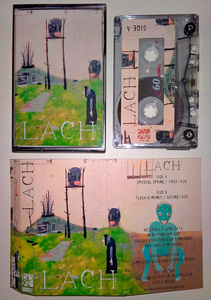 LACH - Self Titled [Reason Art Records - 2016]Here we have the first release from LACH- a new collaborative project that brings together two rather creative euro noise makers. The release comes in the form of a C60 (and digital download) on up & coming Russian noise/ walled noise label Reason Art Records. The LACH project brings together Uk based Clive Henry( known for his progressive & experimental walled noise work), and Italian based Lorenzo Abattoir( of suicidal walled noise project Nascitari, and more experimental noise projects such as PSICOPOMPO & Tomorrow I'll Shoot Myself In The Mouth) In the early summer of 2015 the pair did a mini UK tour together, and this release utilizes recordings from one of these shows( the Nottingham date on June 7th)- though I’m not sure if these have been altered or adjusted before been released. I was lucky enough to see the pair when they played a London date on this tour, at that show they did play separately & not as a pair, though that said I do recognize elements from both of the solo sets I heard here, so I'm guessing the two tracks could be constructed around elements from various performances.….anyway what is offered up here are two nearing thirty minute tracks, that are shifting, often layered, and very creative blends of static texturing, noise based improv, progressive walled-noise/ ANW, and general clever experimental sound-making. The first sides track is entitled "Spiteful Spring/ first LACH", and this opens with an oddly eerier, fairly cryptic & layered blend of rubbing textures, spinning/ snoring sounds, whistling's, odd shifting & scribbling. From here on the track shifts though blends of haunting pipe music samples & shifting/ cut noise layers. Onto flair complex maps of pop, snaps, unsettling breathing sounds, cut layers of feed-back, and almost rhythmic electro pluses. Though to dense yet no less detailed ventures into blends of galloping yet awkward wall work, rattle ‘n’ scratching, and strange forkings. In all there is a lot of very interesting/ creative things going on here, and the pair nicely pull them all together into a cohesive & worthy bit of noise-making, that really manages to step out of genre labels Side two’s track is entitled "Flesh Is Money/ second LACH". This track opens up with a selection of breathing & semi-hyperventilating noises, which are blended with scatterings of feedback, building almost harmonic/ groove based noise textures, and cable buzzers. Once again this track is fairly shifting & episodic in it’s unfolded, though it maybe feels a little more intense & dense in much of its sonic landscape. As we move from creative blends of detailed yet thick wall-matter. Though to unsettling seas of honking & wailing vocalizing, spindly & crackling noise texturing, and unsettling improv meets ambience back drops. Onto often jarringly altering sondscapes that move from blends of thick pelting/ hissing noise texturing & rattling/ knocking, onto to pared back yet still very taut blends of static haze & forking draggings. Really this side is on par with the first sides track, and offers up another very eventfully, clever, and extremely worthy bit of noise craft. Sadly I’d already picked my best of 2016 before I got round to hearing this, but if I’d heard it sooner it would have most definitely featured in my list- as there is so much thought, depth, and sound-crafting talent gone into this release. Really if you have even a passing interest of more eventful & progressive walled noise/ static texturing this first LACH release is a must have.