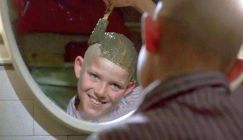 Anyway one night Michael gets visited by two ghosts of the old folks who died in the home fire- they give him a recipe for a bizarre potion, which among a host of weird ingredients features Peanut butter- he’s only meant to use one spoonful, but as it won't stick to his head he adds in another four spoonful- come the next morning his hair starts growing at a rapid manner- so his friends have to keep cutting it. One day, once again fed up with his predicament, he falls asleep & gets kidnapped by Singor who has been fired from the school. We find out that he has kidnapped over twenty children- and these he has working in a factory cutting & processing Michael constantly growing hair- into paintbrushes that create paintings you can jump into, various clothes, and even curtains. Yep, this is completely bonkers plotting- added to this we have the often very inappropriate for a family film touches- like Conard putting the potion ‘down-there’ so as a result he has long black public hair growing out of his trouser legs, the troubling loss of Micheal hair & the way it’s liberally mocked by everyone, the rather creepy elderly ghosts who come & steal food from Micheal house at night, and of course the hair farming creepy ex-teacher-come-kidnapper. It's amazing, this oddity was ever made, and then, of course, focused at a family market- so understandably it caused a fairly bit of fear & trauma for those who saw this as children.