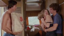 The film starts in a fairly campy 1970’s manner- as we get a blend of upbeat country-rock , & seriously cheesy, at points fairly homo-erotic pictures of the two Best Friend leads- Jesse(Richard Hatch from 70’s TV Sci-Fi series Battlestar Galactica), and cheeky ‘n’ unpredictable Pat(Doug Chapin). As we get into the film we find Jess, his girlfriend-soon-to-be-wife Kathy(Susanne Benton), and Pat’s girlfriend Jo(Ann Noland) waiting at the station for Pat to come back from his time severing in Vietnam. Fairly soon the four decide to hire an RV, and drive back across the states for one last road trip before they both settle down into civilian working & married life. Fairly soon it’s clear that Pat is rather spontaneous & playful young man- as he buys a motorbike on a whim which he rides in front of the RV, is constantly joking, and later convinces his girlfriend Jo to dance topless on a bar stage, next to a cross looking old stripper. Fairly soon the group starts to get in disagreements, flights & issues due to Pat's behavior- and it becomes clear he’s more than a little unbalanced as he starts manipulating his friends. As things progress the mellow/laid back tone of film & it’s lulling-to-grooving county/ southern rock soundtrack recedes more & more. As we drop into the more taut, tense, later fairly jolting & shocking thriller part of the film- though still even at this point the tone will suddenly switch back mellow/ playful which is most jarring & effective.
