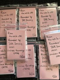 The white and plain C90 cassette is presented in a tape hugging baggie- this features a pink paper inlay with handwritten text on- all in all, it nicely fits with the other Rien releases, with its theme-less/ sparse look.