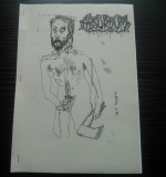 Contents wise is a very loose, undated & lo-fi collection of art- moving from line drawings of Perrot naked & aroused with axes, chainsaw, ect- on his own or with women. Very crude mixes of thick scribbles & stuck on porn collage, Vomir themed lo-grade comic strip, French hand written texts, various derange & perverse drawings( that look like they were done by a highly troubled child). The whole thing certainly follows the crude & often disturbed feel of his sonic work, and while it’s not the most varied of art-zines, it does make an nice visual companion to his sonic endeavours.