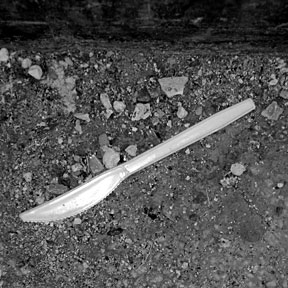 The cover for the disc is a simple glue pocket and the CD itself appears to be a high quality pro-pressing. The cover art features a butter knife atop a gravelly stone surface. Done in black in white, it’s simple but effective.