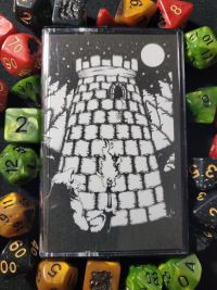 The cassette version of the release came in an edition of twenty-five copies- with the labelled on both sides black shelled coming in a doubled sided black and white cover. This features on its front cover a drawing of a hooded adventurer holding a flaming torch, looking up at a stone tower- where a skeletal arm hangs out of a window. Inside we get the track listing, and the release comes(on theme) with a role-playing die.