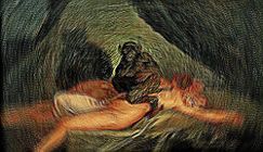 The packaging for this split is rather curious, mixing obvious effort with distinct ugliness - to my eyes anyway. The oversized cassette case has a simple insert, adorned with a bloody image; inside is a translucent red tape and a small bag with another insert and what appears to be an animal tooth. All good so far, but the top of the bag is taped to the case; and to my nit-picking eyes it looks a little ugly. I realise I’m being picky, but here we are.